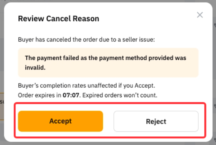 Check if your completion rate has been affected due to the seller rejecting your request in the respective order chat box before appealing your completion rate.