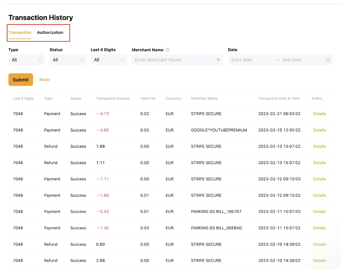Step 2: On the Transaction History page, you can view your transaction details under Transaction and Authorization. You can use the filter types below to find more precisely the transaction records you wish to view. Then, click on Submit.