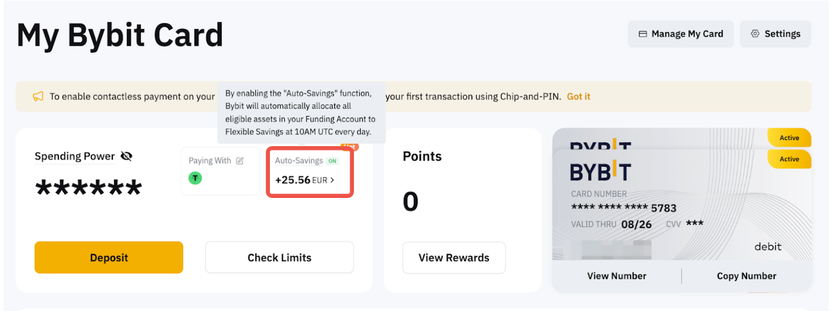 Además, puedes ganar intereses compuestos sobre tus ahorros flexibles (no disponibles directamente en la página de ahorros de Bybit) habilitando la deducción automática en el panel de tu tarjeta Bybit.