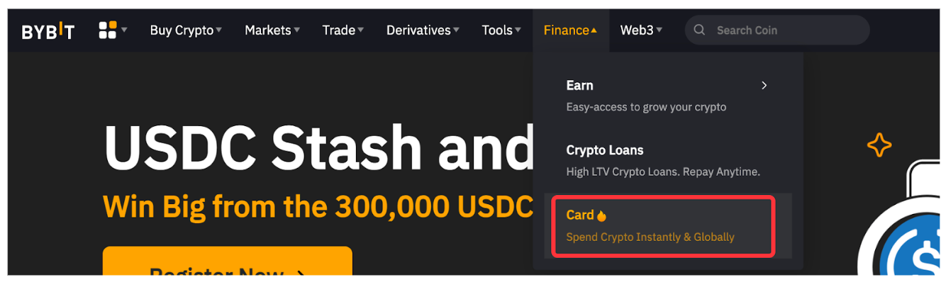 Paso 1: Haz clic en Finanzas en la esquina superior izquierda de la barra de navegación en la página de Bybit, luego selecciona Tarjeta para acceder a la página de la Tarjeta Bybit.