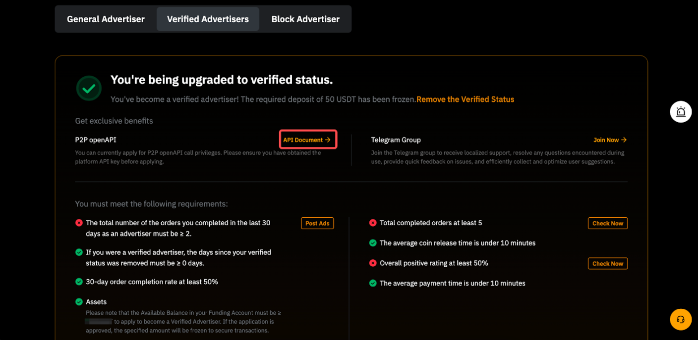 Ao expandir o acesso à API, você poderá gerenciar seus anúncios e ordens P2P, dependendo das configurações de desempenho da chave API.