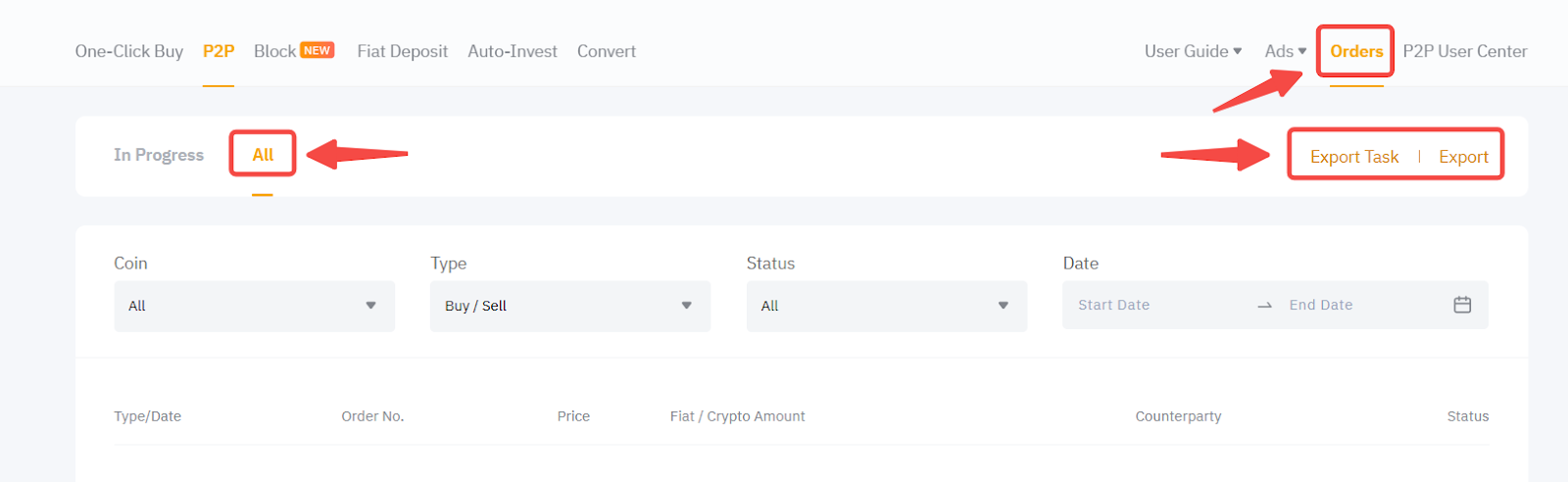 Você pode exportar informações sobre suas ordens P2P clicando no botão Exportar, no canto superior direito desta página. Observe que a função Exportar está disponível apenas no site da Bybit.
