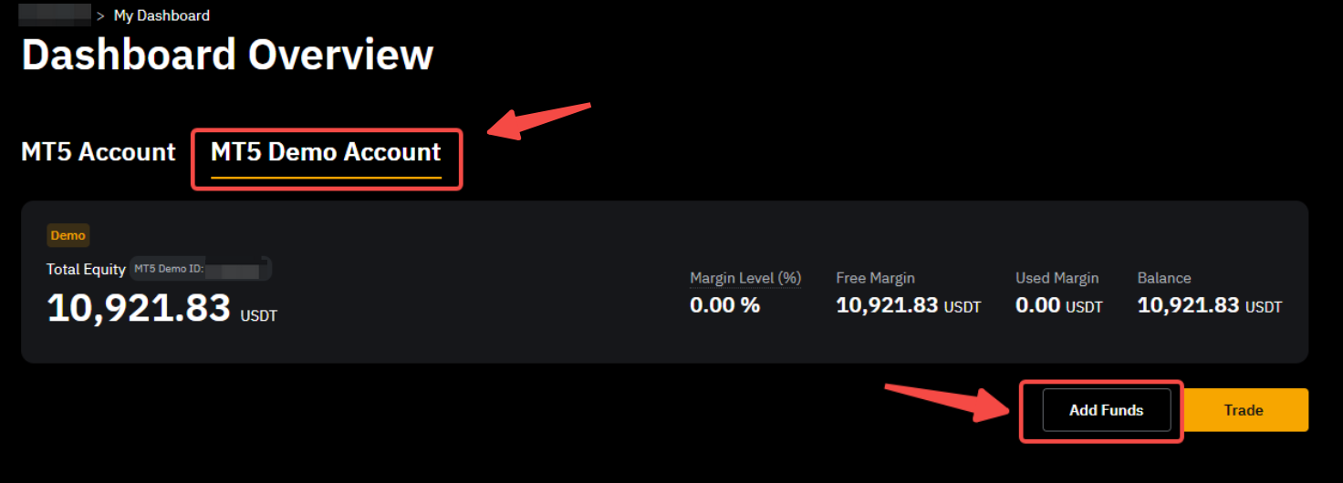 Users can access their Demo Account Dashboard as seen in the screenshot below and click on Transfer to add demo funds to their TradFi (MT5) demo account.