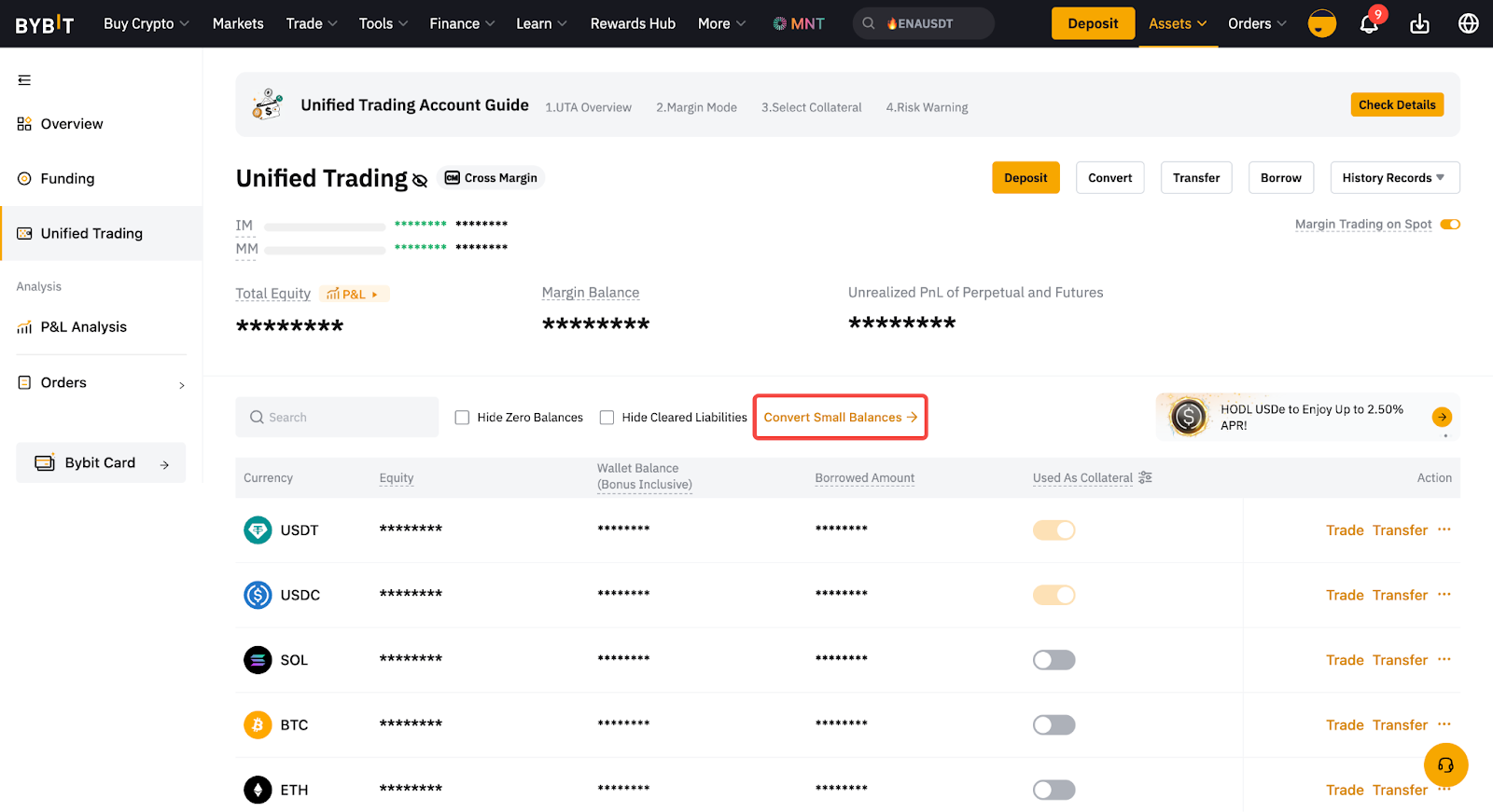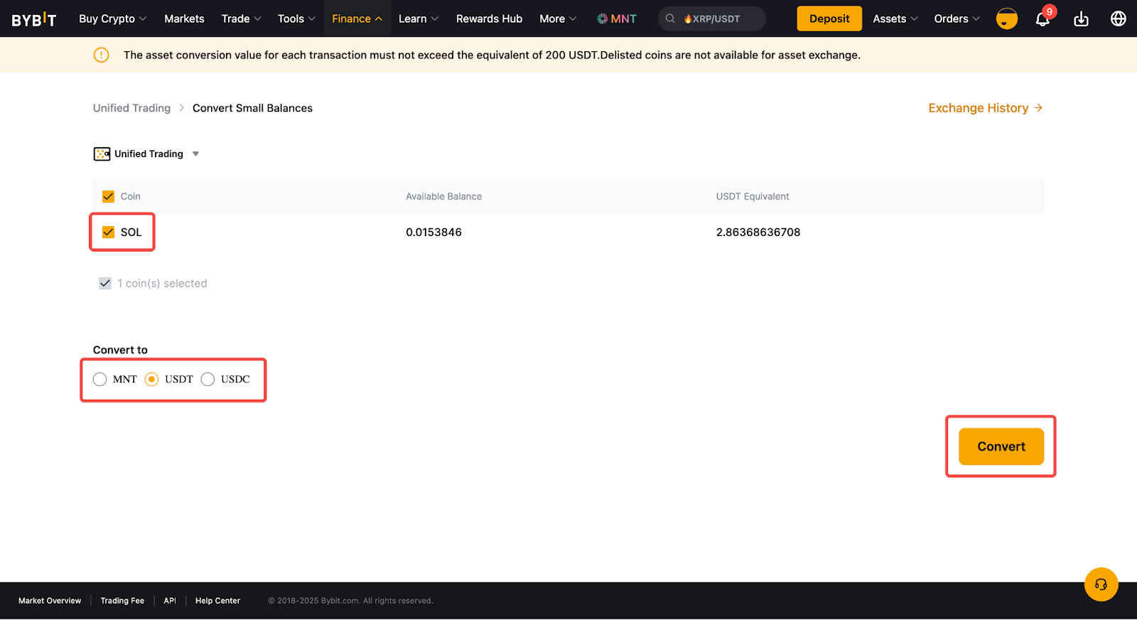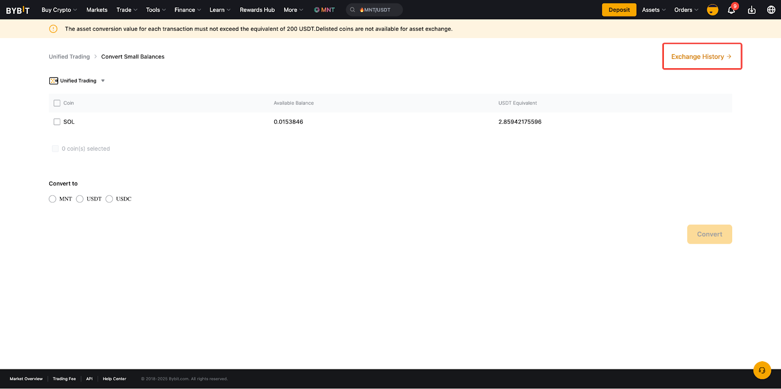 To improve the utilization of small assets in your Bybit account, you can convert any assets worth less than 0.001 BTC or equivalent into MNT, USDT, or USDC in a single conversion by following four simple steps. The conversion of small balances is supported using both the Funding Account and Unified Trading Account (UTA). Please note that the small balance conversion is limited to once every 1 hour.