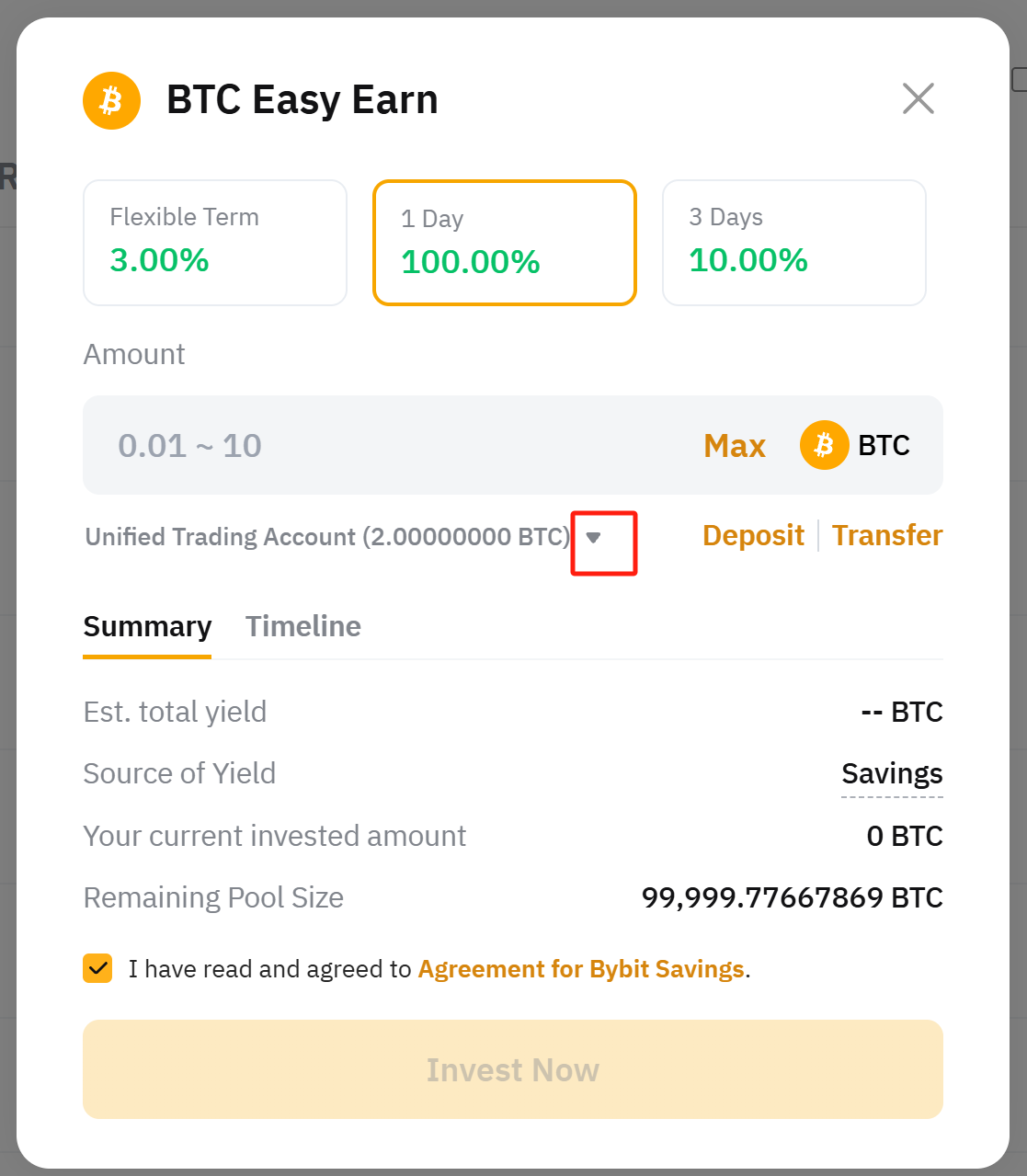 Depending on the product, you may be able to switch between your Funding Account and Unified Trading Account for the investment. You can also view the source of yield: