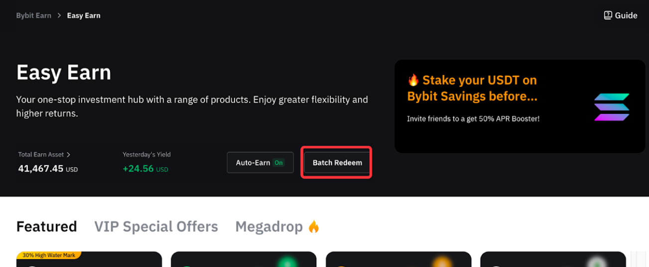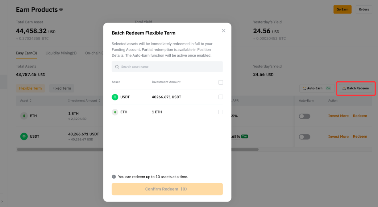 The Batch Redeem feature is also available from the Easy Earn homepage.