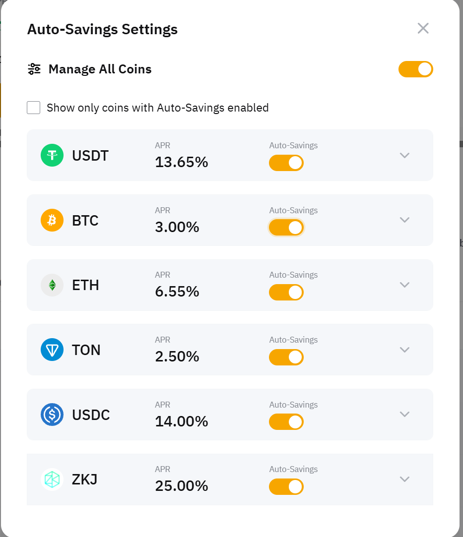 Step 3: Click Confirm. The Auto-Earn Settings page will appear. Manage All Coins is enabled by default. From here, you can toggle Auto-Earn on or off for each supported coin.
