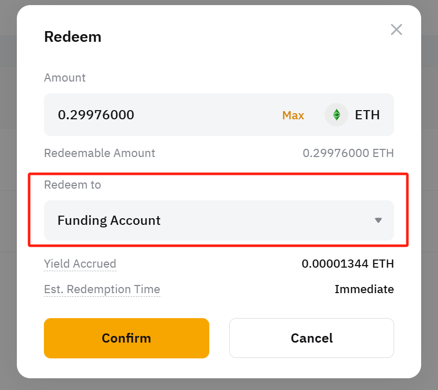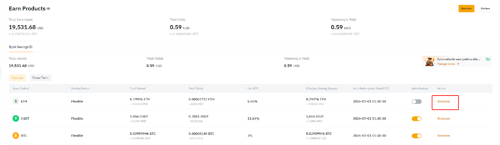 Note: For Fixed Term products, assets cannot be redeemed until the product reaches maturity. Once it matures, your principal and yield will be automatically credited to your Funding Account — no action needed.