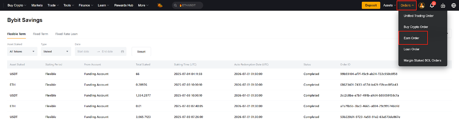 Step 1: Go to Assets → Earn to access the Earn Products page. Select the Flexible Term plan you want to redeem, review the order details and click Redeem.