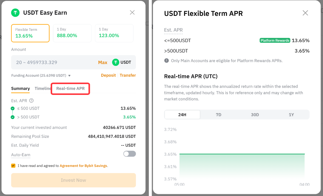 — For Flexible Term products, the real-time APR shown reflects the annualized return rate for the selected timeframe and is updated hourly. It's for reference only and may fluctuate based on market conditions.