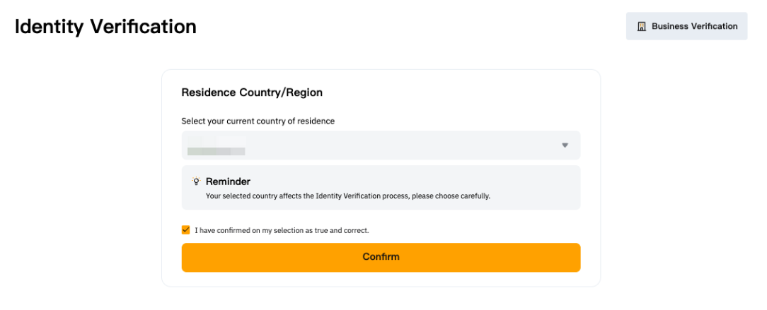 第 3 步: 選擇您目前的居住國家/地區。請選擇正確的居住國家/地區,因為它們會影響您的驗證程序。如果您希望在確認後進行變更,可能需要進行其他驗證。