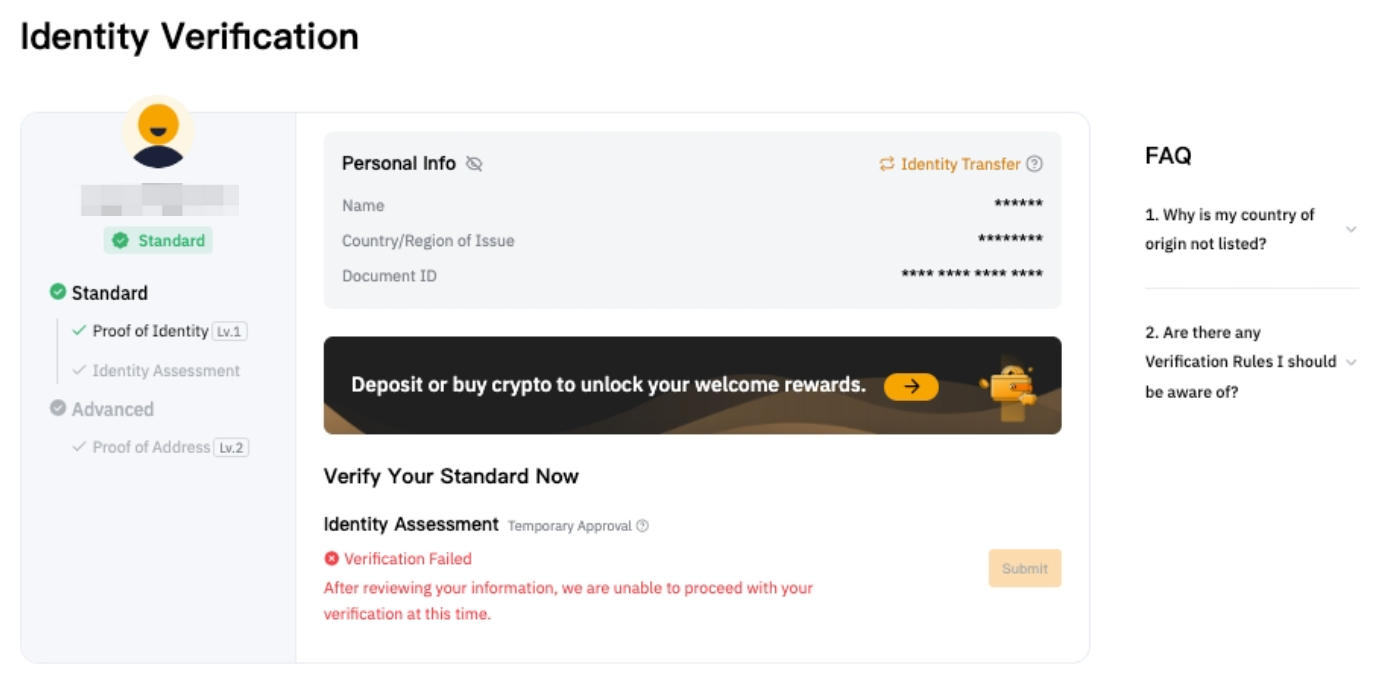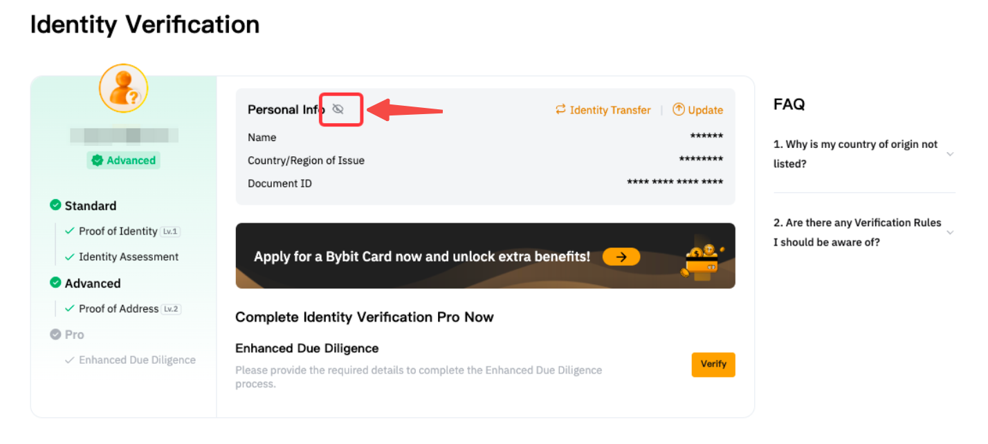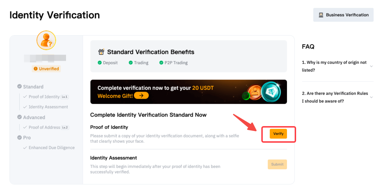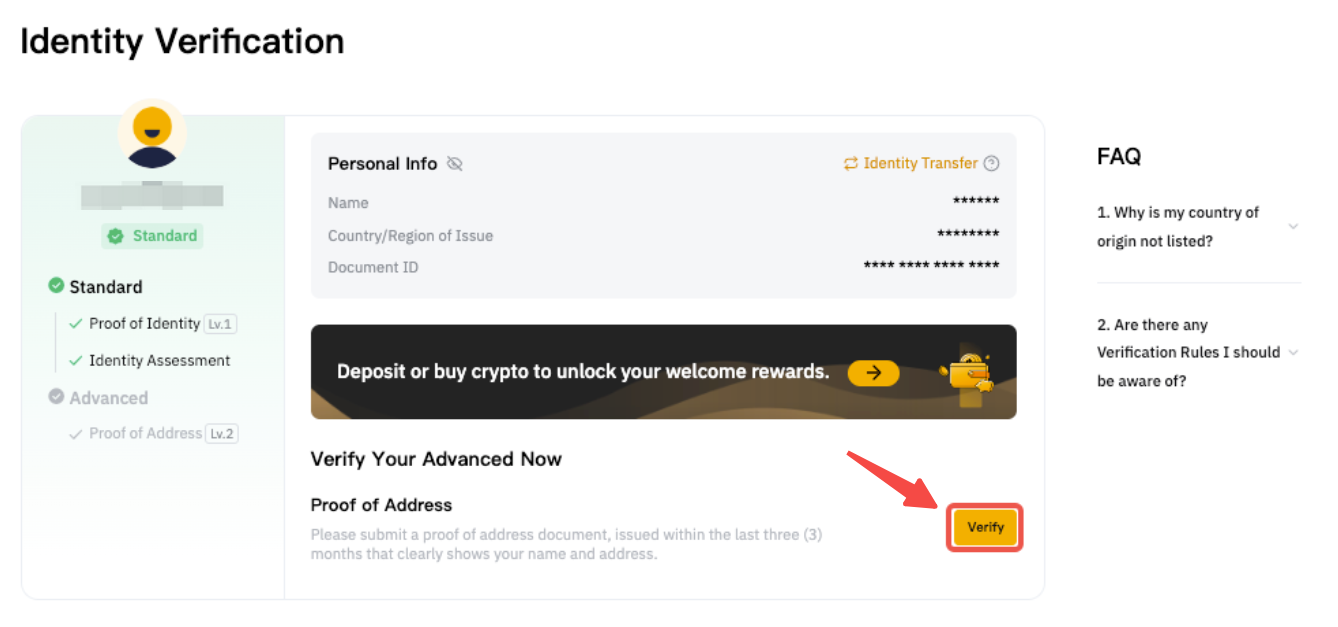 個人身分驗證分為三個層級:標準、進階及專業。這三個層級之間的福利與提款限制差異,可見於不同 KYC 層級的益處。本文提供完成標準、進階和專業級身分驗證的逐步指南。