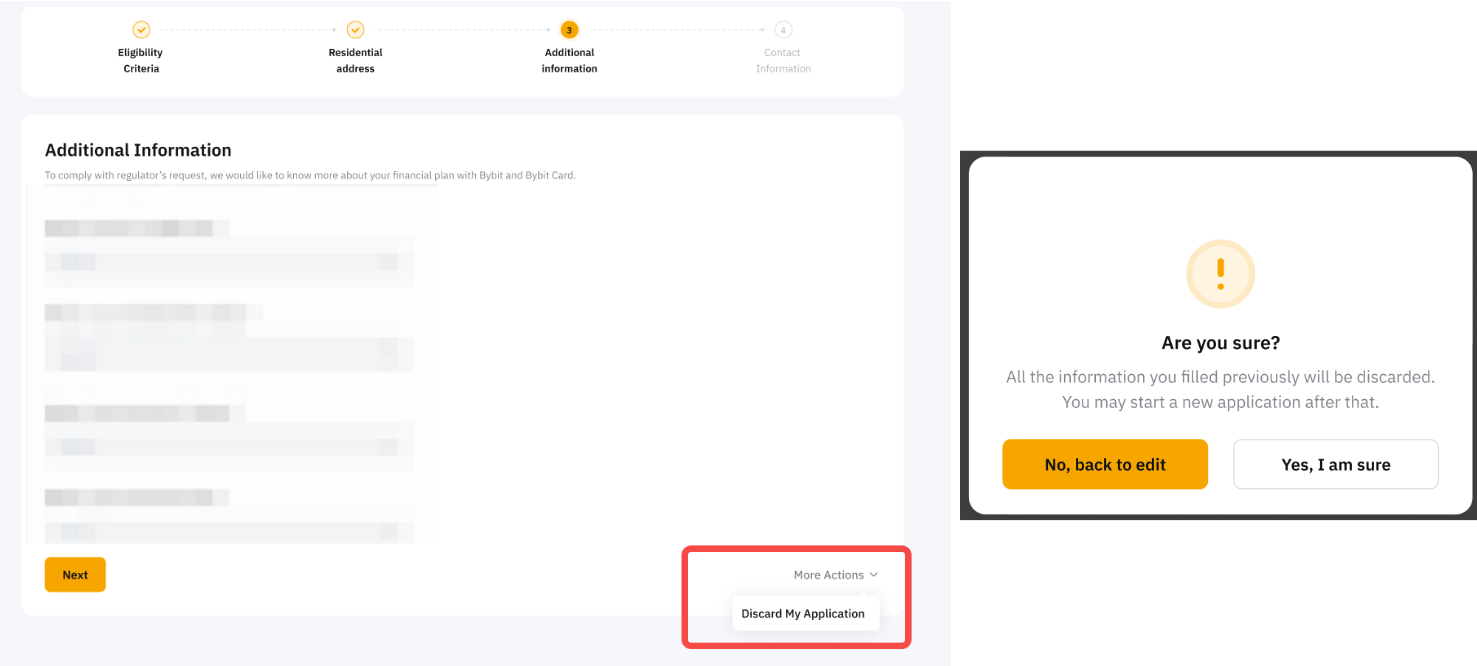 You can cancel your Bybit Card application by clicking on View my application → More Actions and selecting Discard My Card Application