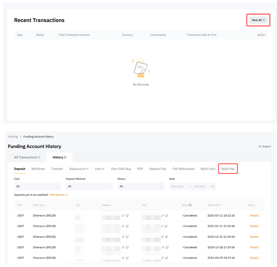 On the website, go to the Bybit Pay page, scroll down to the bottom to find the Recent Transactions, and click View All. Alternatively, you may find the transaction history by going to the Funding account →History → Bybit Pay.