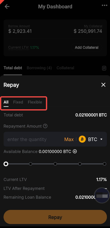 - If you enable Auto-Repay, the system will automatically use assets from your Funding Account to repay your loan upon expiry. Make sure your account has enough funds to cover the full repayment; otherwise, the automatic repayment will fail.