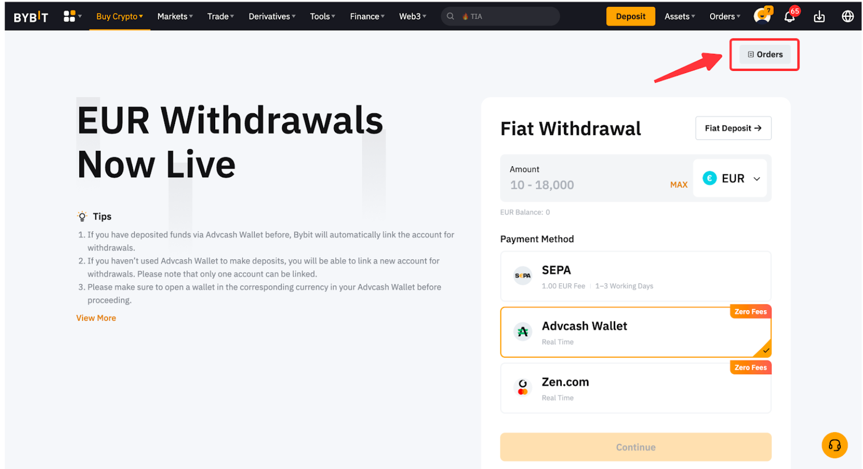 To view your fiat withdrawal history, please click on Orders in the upper right corner of the Fiat Withdrawal page.