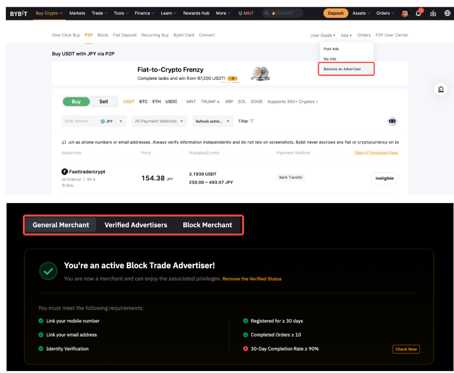 Step 1: Go to the Become an Advertiser page on the Bybit Website, scroll to the bottom, and select the type of advertiser you want to be.