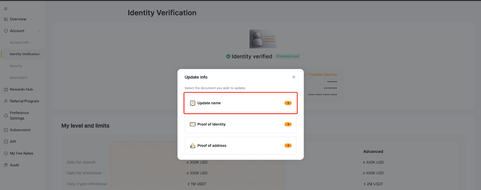 Step 1: Hover your cursor over your profile icon and click on Account. Next, select Identity Verification page and tap Update Info.