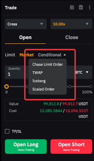 A TP/SL order allows you to set a target price to trigger a close order to secure profits or limit losses. For more details, refer to Introduction to Take Profit and Stop Loss (Perpetual and Futures Contracts).