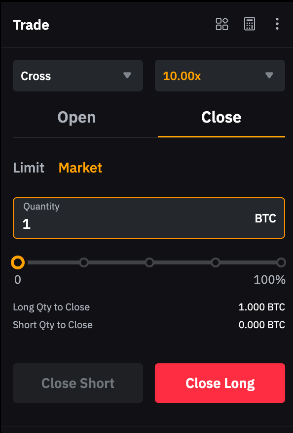 For example, to close a 1 BTC long position, place a 1 BTC short market order. Please note that if the order quantity exceeds your current position size, a new position in the opposite direction may be opened.