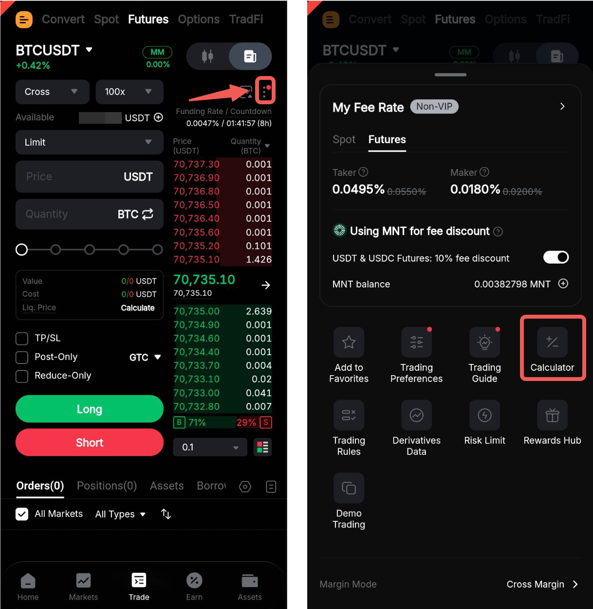 ステップ1:ウェブサイトでは、注文ゾーンの左下にあるBybit計算機をご利用いただけます。アプリをご利用の場合は、「取引」に移動し、右上隅にある三点リーダーアイコンをタップして取引設定ページを開きます。