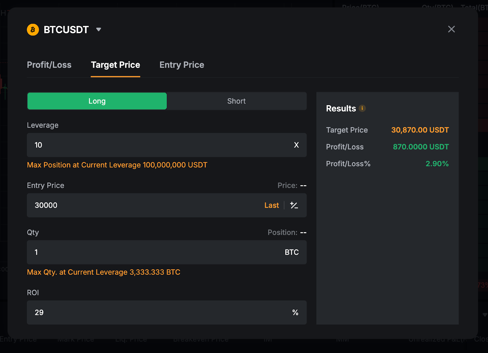 上記の値を入力すると、ポジションが29%のROIを達成するには、ターゲット利食/決済価格を7,280 USDT前後に設定する必要があると算出できます。
