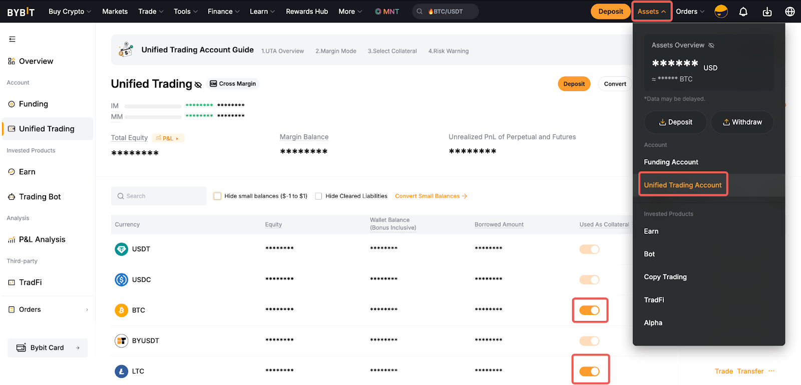 担保設定をカスタマイズするには、カーソルを「資産」タブに合わせ、「統合取引アカウント」をクリックします。切り替えボタンを使い、担保として使用する資産をカスタマイズしてください。