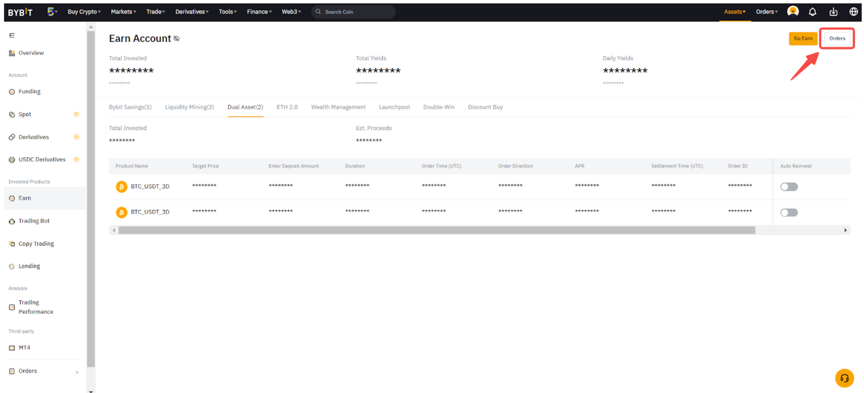 デュアル資産投資タブで現在の注文詳細を表示するか、ページ右上のすべての注文をクリックしてデュアル資産投資注文履歴を開くことができます。
