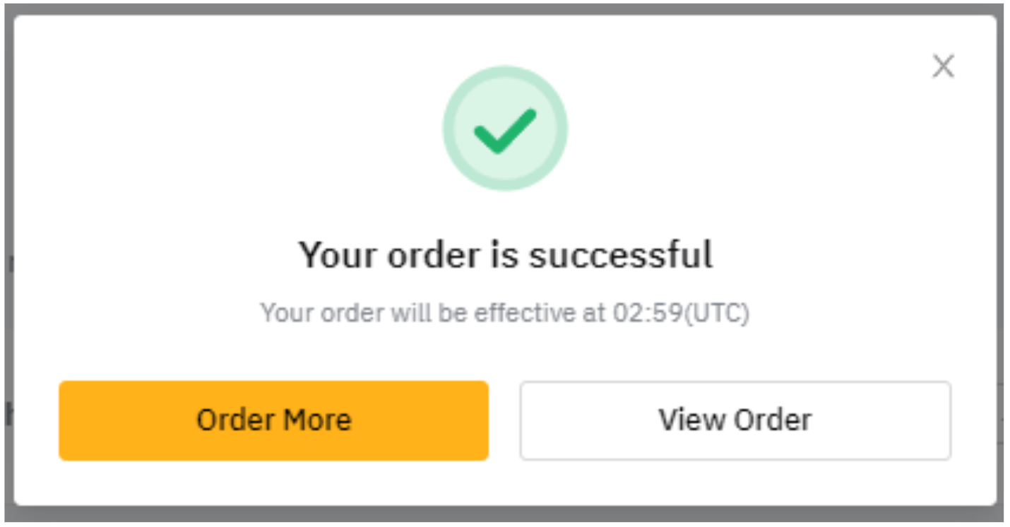 注文が正常に送信されると、注文完了を知らせるポップアップ画面が表示されます。ポップアップ画面の注文を見るをクリックすると、デュアル資産投資の注文の詳細を確認できます。