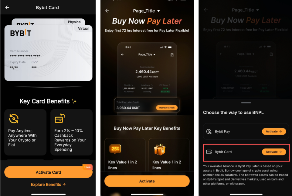 2. The Pay Later homepage (accessible via both the Bybit Card and Bybit Pay homepages): Tap Activate, then select Activate for Bybit Card on the pop-up page.