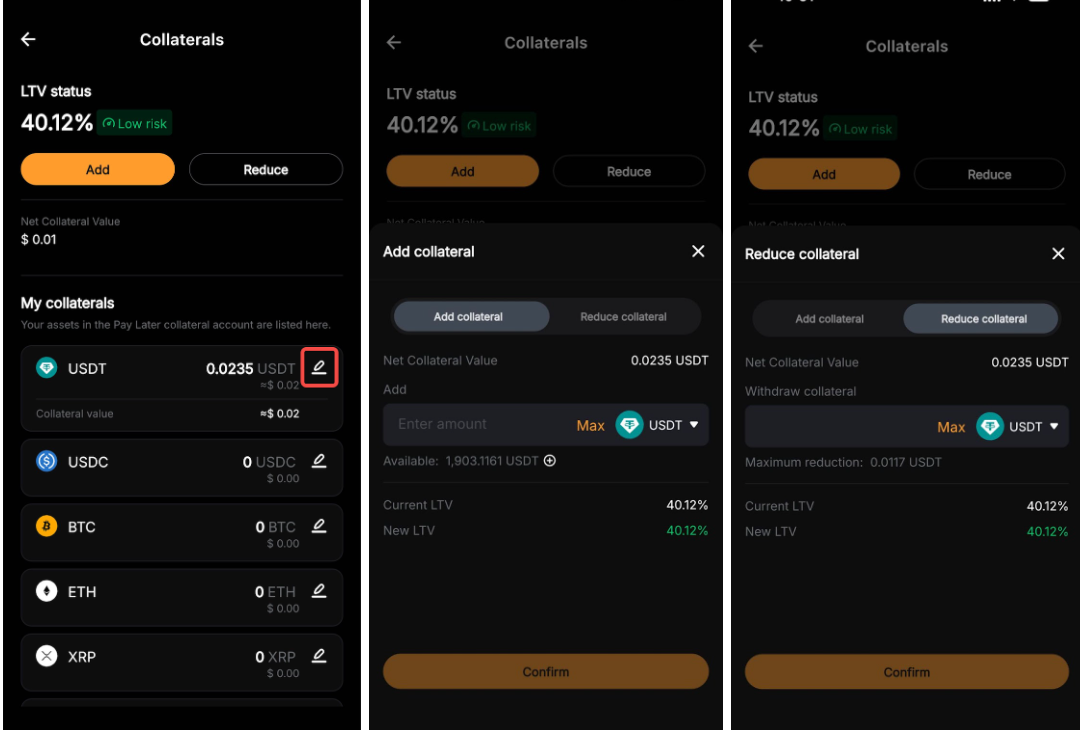You can also adjust the collateral by tapping the edit icon next to an asset under My collaterals.