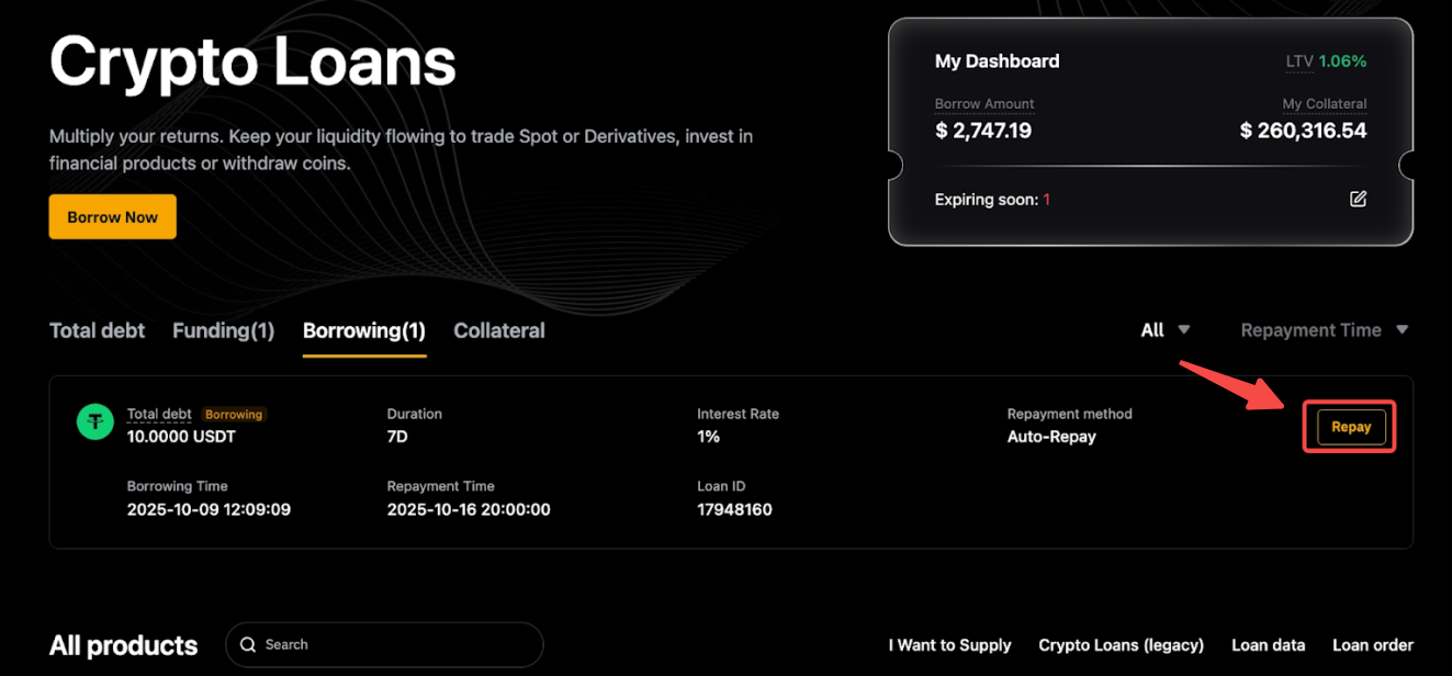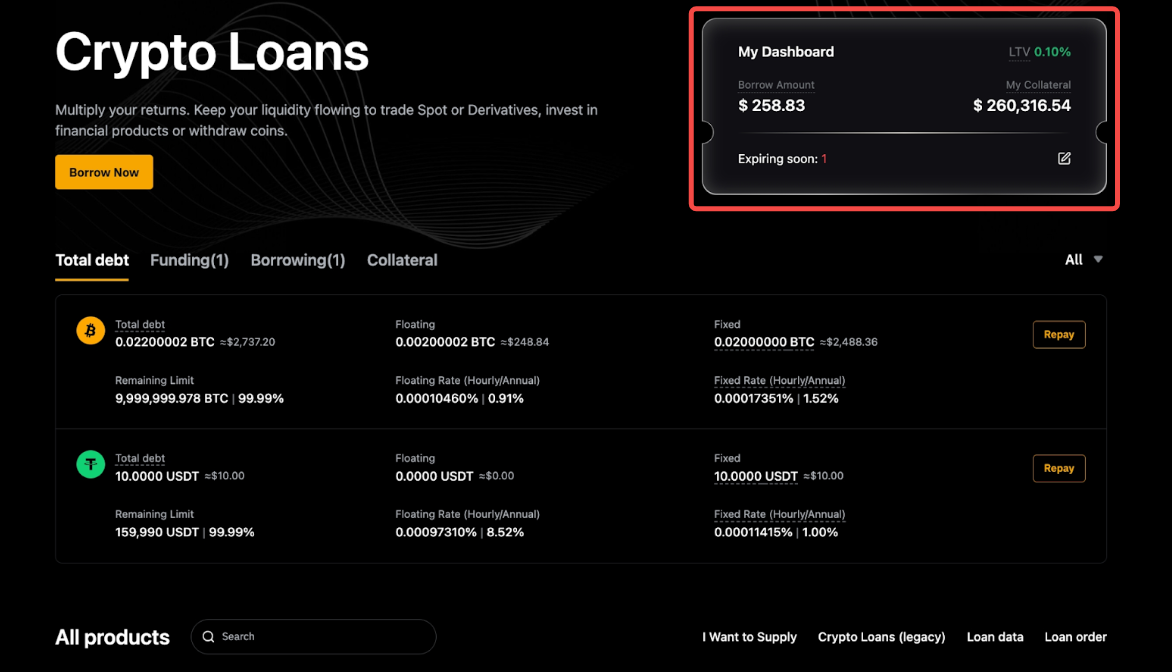 ローンを確認するには、暗号資産ローンのホームページに移動してください。合計借入額、担保、注文の概要が表示されます。