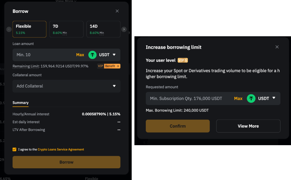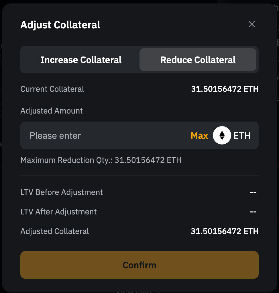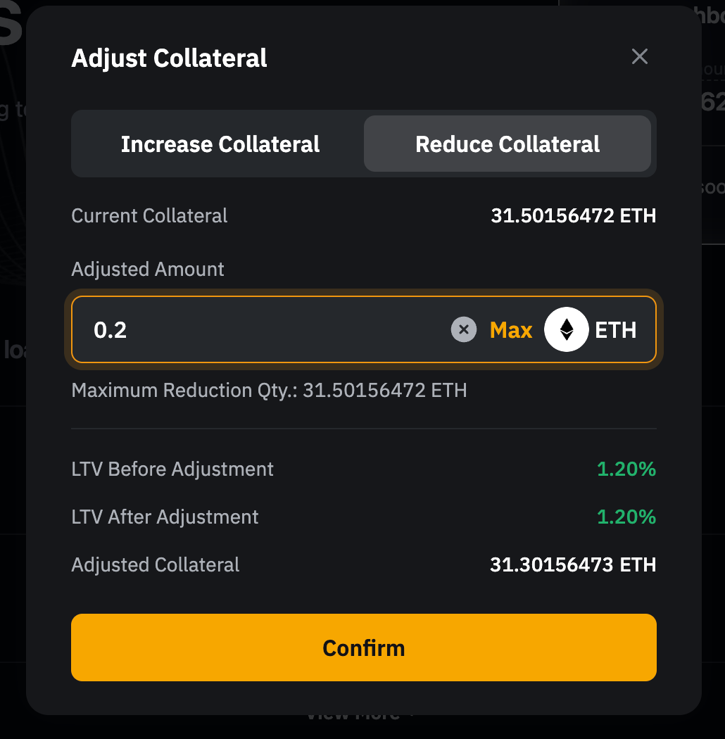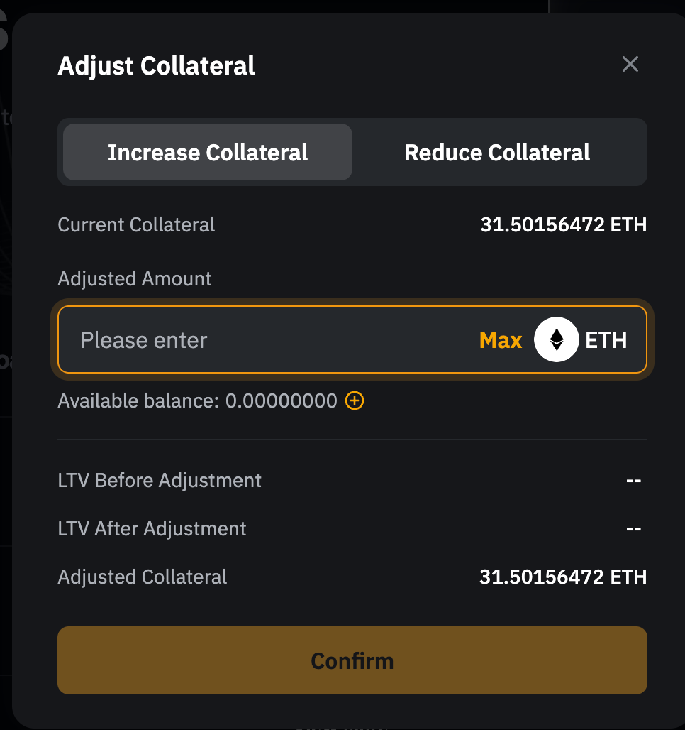 ステップ2:担保額を調整するには、担保額を増やすタブに移動します。追加したい金額を入力するか、「最大」をクリックして資金調達アカウントの利用可能な残高全額を使用します。担保を追加するとLTVが下がり、清算リスクが低減します。