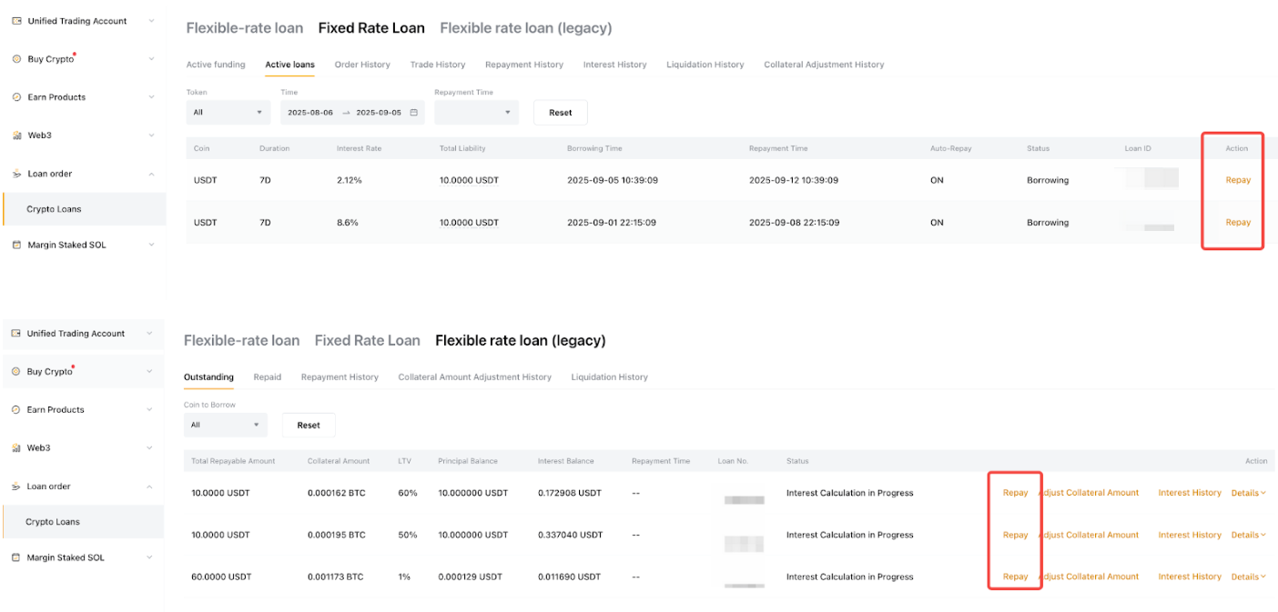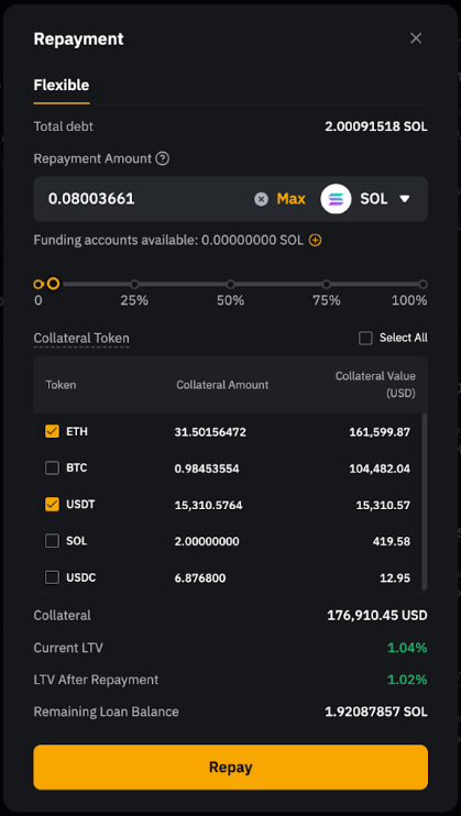 また、返済に複数の種類の担保を選択することもできます。確認ポップアップで返済詳細を確認し、返済をタップします。担保コインを使用して暗号資産ローンを返済する場合、手数料が適用されます。 手数料率は、担保資産と借入資産の返済手数料率のうち、高い方が適用されます。