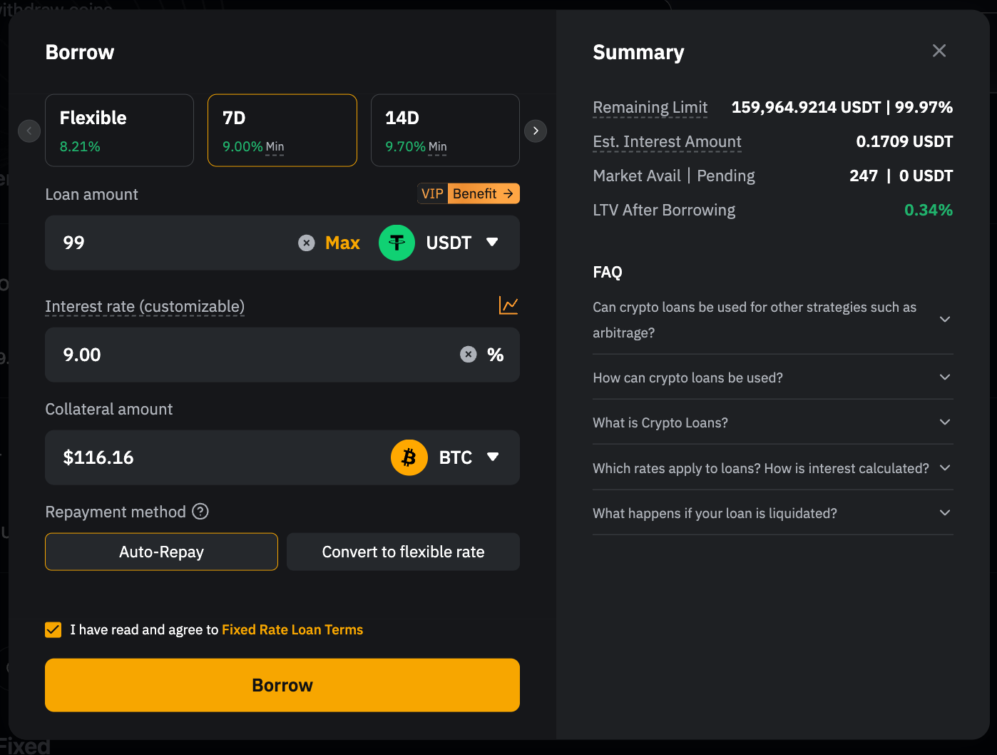 借入後のLTV、時間/年間金利、および推定日次利息が自動的に計算されます。