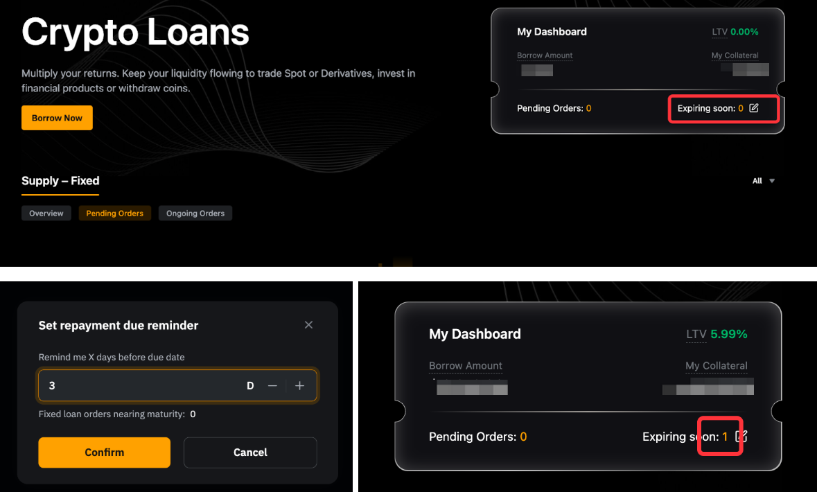 ・「返済期日」のリマインダーを有効にするには、暗号資産ローンのホームページに移動し、「マイダッシュボード」の「満期日」の横にある「編集」アイコンをクリックし、期日前の日数を設定します。 返済期限が迫ると、期限切れの商品数がまもなく期限切れの横に表示されます。