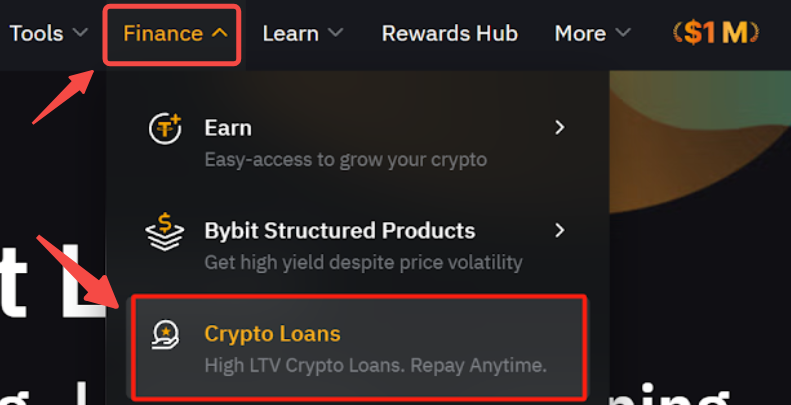 ステップ1:Bybitウェブサイトにログインし、ナビゲーションバーの「ファイナンス」→「暗号資産ローン」をクリックして、暗号資産ローンページにアクセスします。