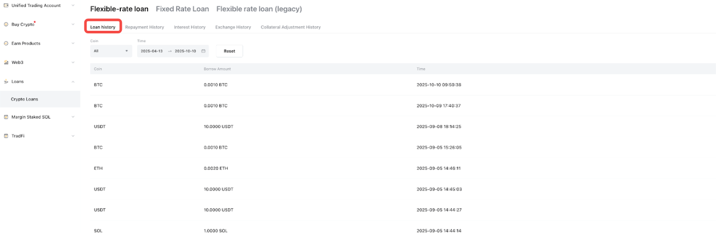 すべての注文の完全なリストを表示するには、概要ダッシュボードのローン注文をクリックします。 暗号資産ローンのすべての注文は、貸し出し、返済、利息、担保などの詳細情報を含む、借入(固定)、フレキシブルレートローンなどの商品タブを上に切り替えて確認できます。また、資産や時間でフィルタリングして結果を絞り込むこともできます。