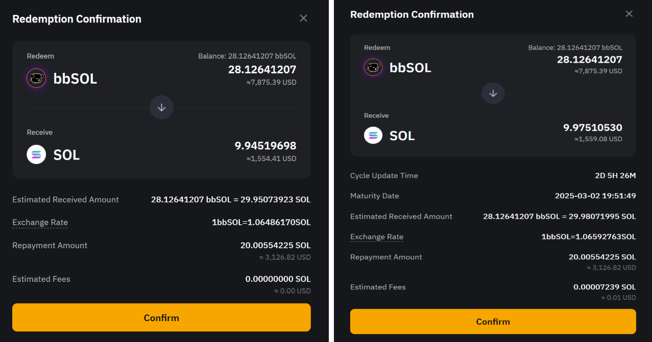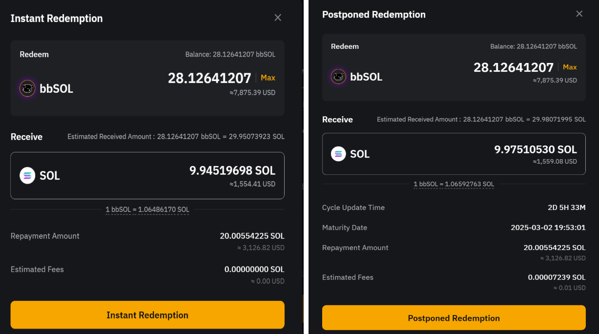 ステップ3:確認のポップアップが表示されます。次に、償還したいbbSOLの金額を入力します。すべての残高を償還したい場合は「最大」をクリックします。リアルタイム交換レートに基づいて、受取可能なSOLの合計額と、ローン返済額や適用される手数料を差し引いた後の最終的な金額が自動的に算出されます。詳細をよく確認し、「即時償還」または「遅延償還」をクリックして次に進みます。