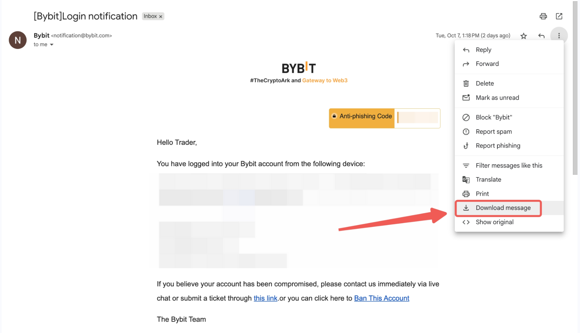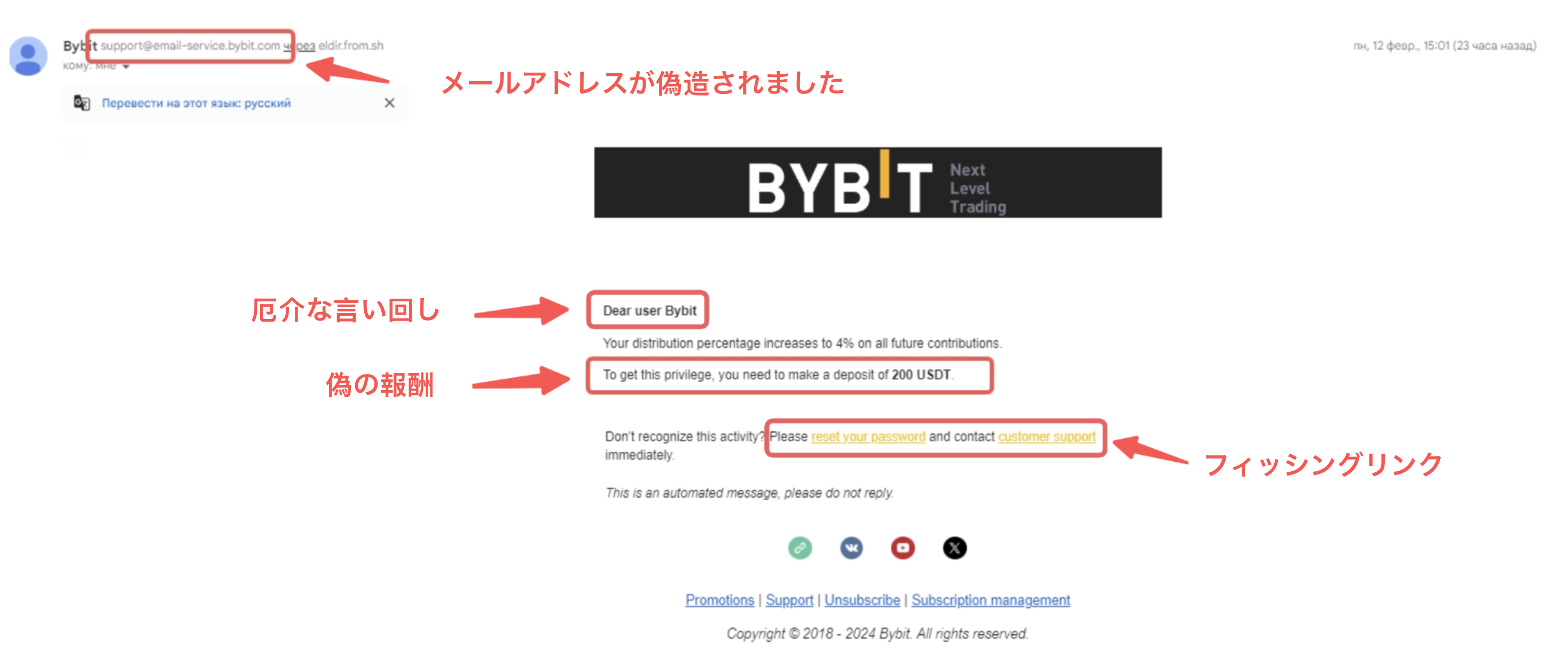 前述のとおり、認証チェッカーで「公式」と出ても、送信者情報は偽装されている可能性があります。以下は、詐欺師がメール送信元アドレスを偽装してBybitユーザーから資産をだまし取ろうとする典型的な手口の例です。