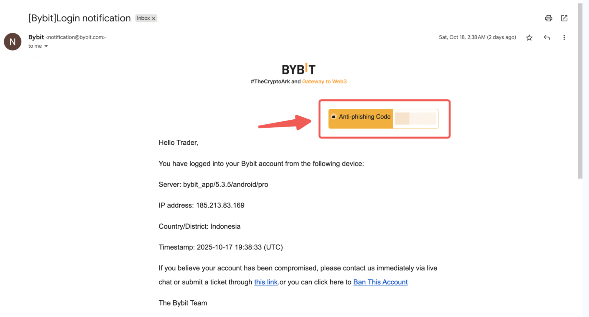 Bybitのアンチフィッシングコードは、英数字や特殊文字で構成されたセキュリティ機能です。有効化すると、このパーソナライズされたコードがすべての公式Bybitメールやテキストメッセージに表示され、ユーザーは受信した情報の真正性を簡単に確認できるようになります。