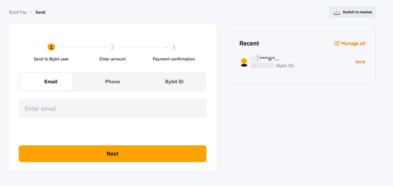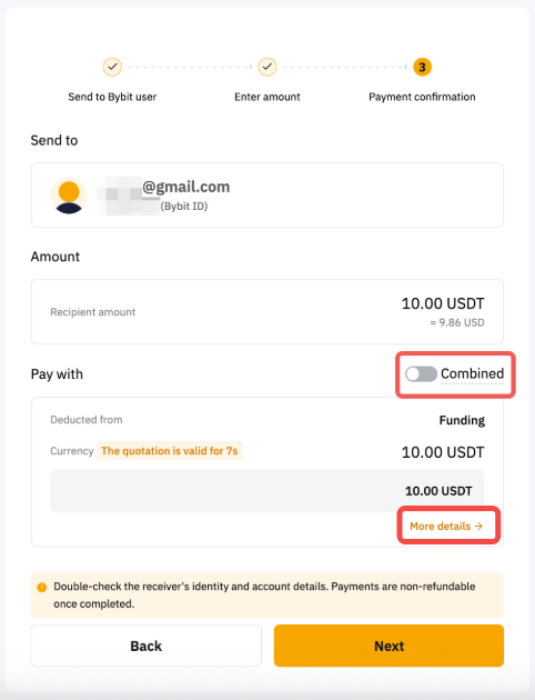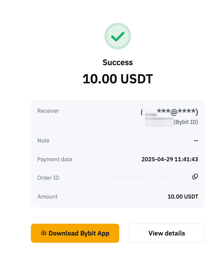 Bybit Pay内部転送を使用すると、取引手数料なしで即座にフィアットを送信し、受信者に暗号を受信させるか、暗号を送信して受信者に暗号資産またはフィアット資産を受信させることができます。現在、この機能を介してフィアットを送信できるのはBybitアプリのみです。Webサポートはまもなく開始されます。