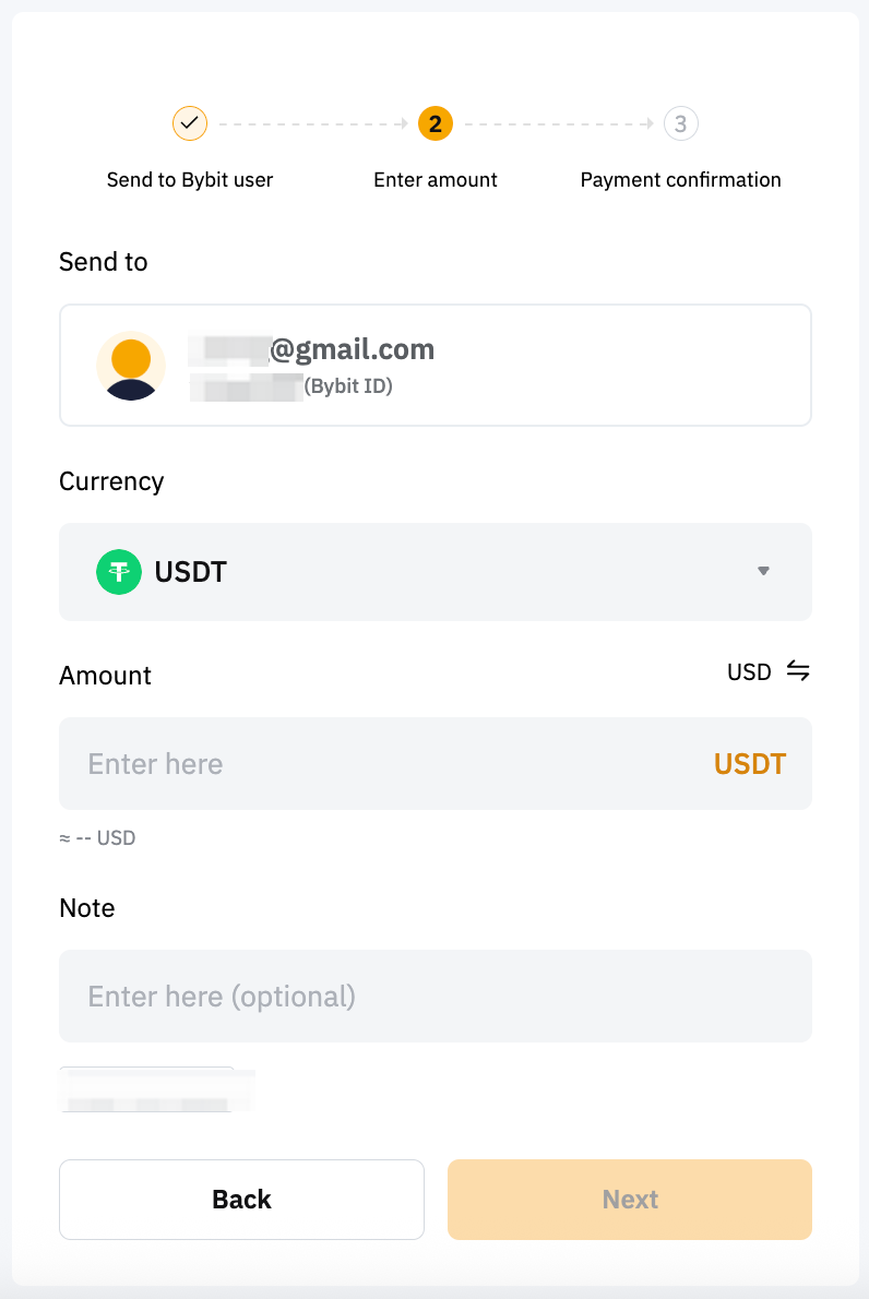 ステップ2:内部送金支払の方法の種類を選択します。他のBybit Payユーザーに支払を送信するには、次の情報を入力します。