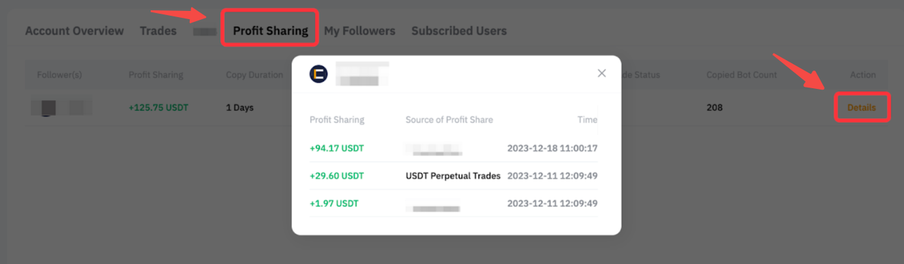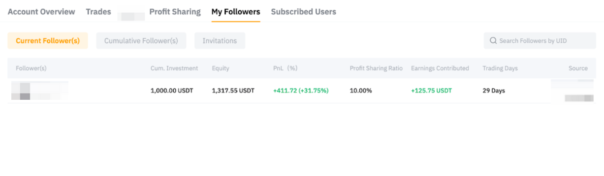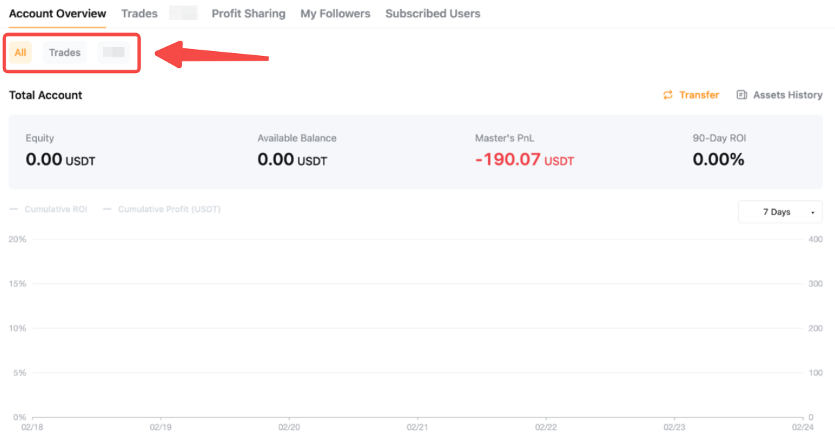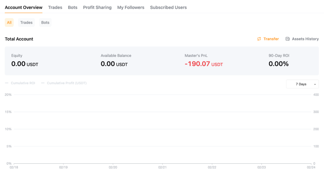 利益分配チャートは、マスタートレーダーの30日間のROIおよび90日間のROIを示します。リアルタイムで更新されます。個別のフォロワーからの分配に関する詳細を確認するには、ナビゲーションバーの「利益分配」タブに移動します。