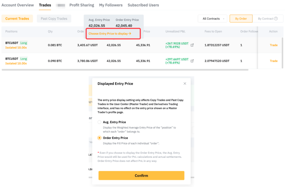 注文詳細に表示される参入価格は、ポジションの平均参入価格であることにご留意ください。表示を注文の約定価格に変更するには、参入価格にカーソルを合わせ、「Choose Entry Price to display(表示する参入価格を選択)」をクリックします。