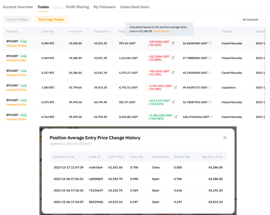 決済済みポジションの詳細を確認できます(決済時刻、決済価格、決済損益、手数料など)。決済損益は、ポジションの平均参入価格に基づき計算されます。決済損益にカーソルを合わせ、「詳細」をクリックすると、ポジションの平均参入価格の変更履歴を確認できます。