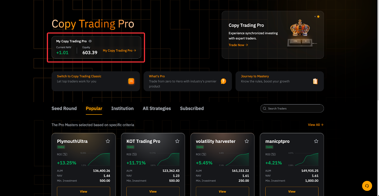 プロマスターセンターにアクセスするには、プロマスターサブアカウントコピートレードプロに切り替え、「マイコピートレードプロ」カードをクリックします。