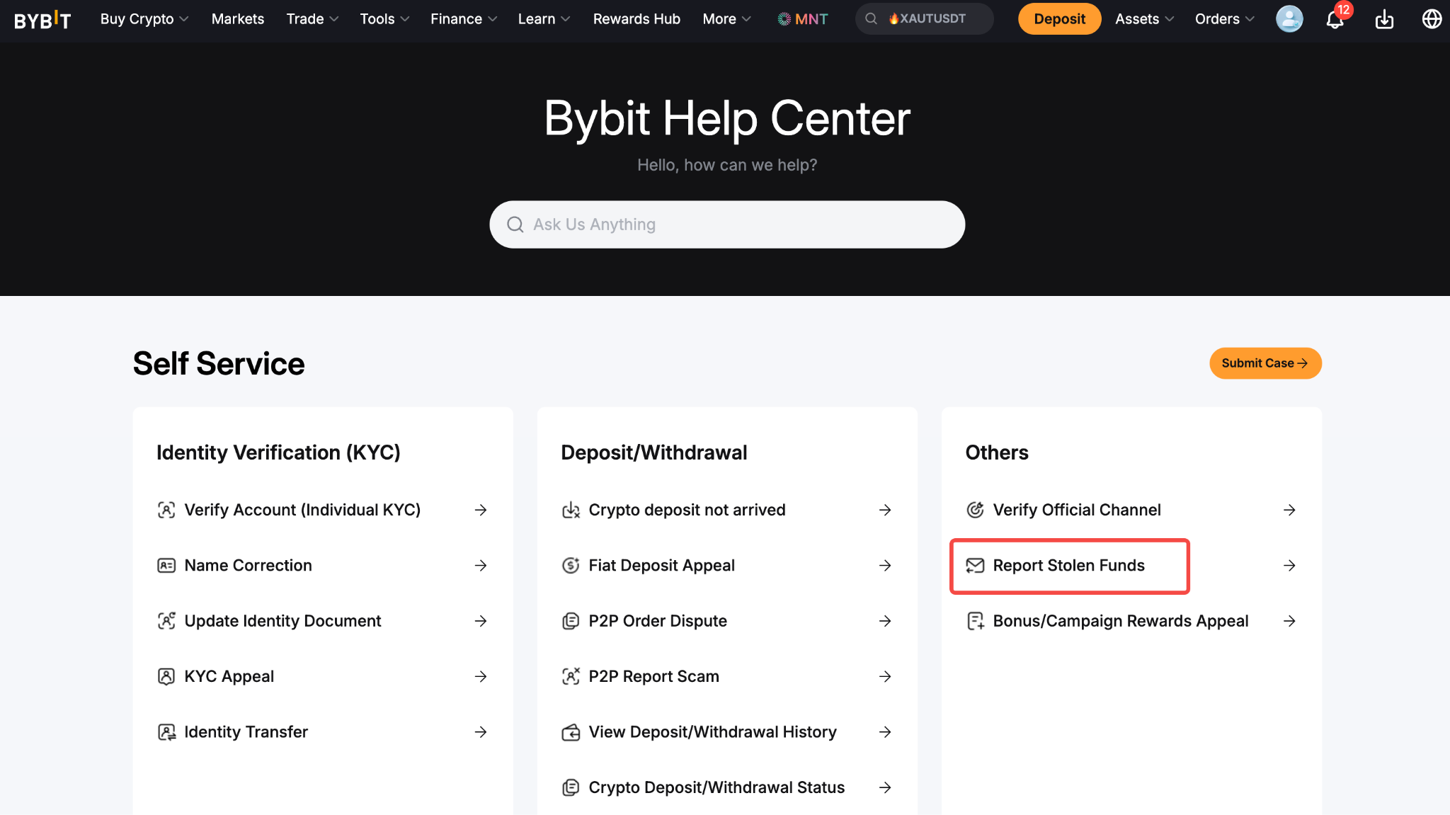 Bybit公式チャンネル認証」ページにアクセスし、「盗難資金の報告」欄の「提出」をクリックしてください。