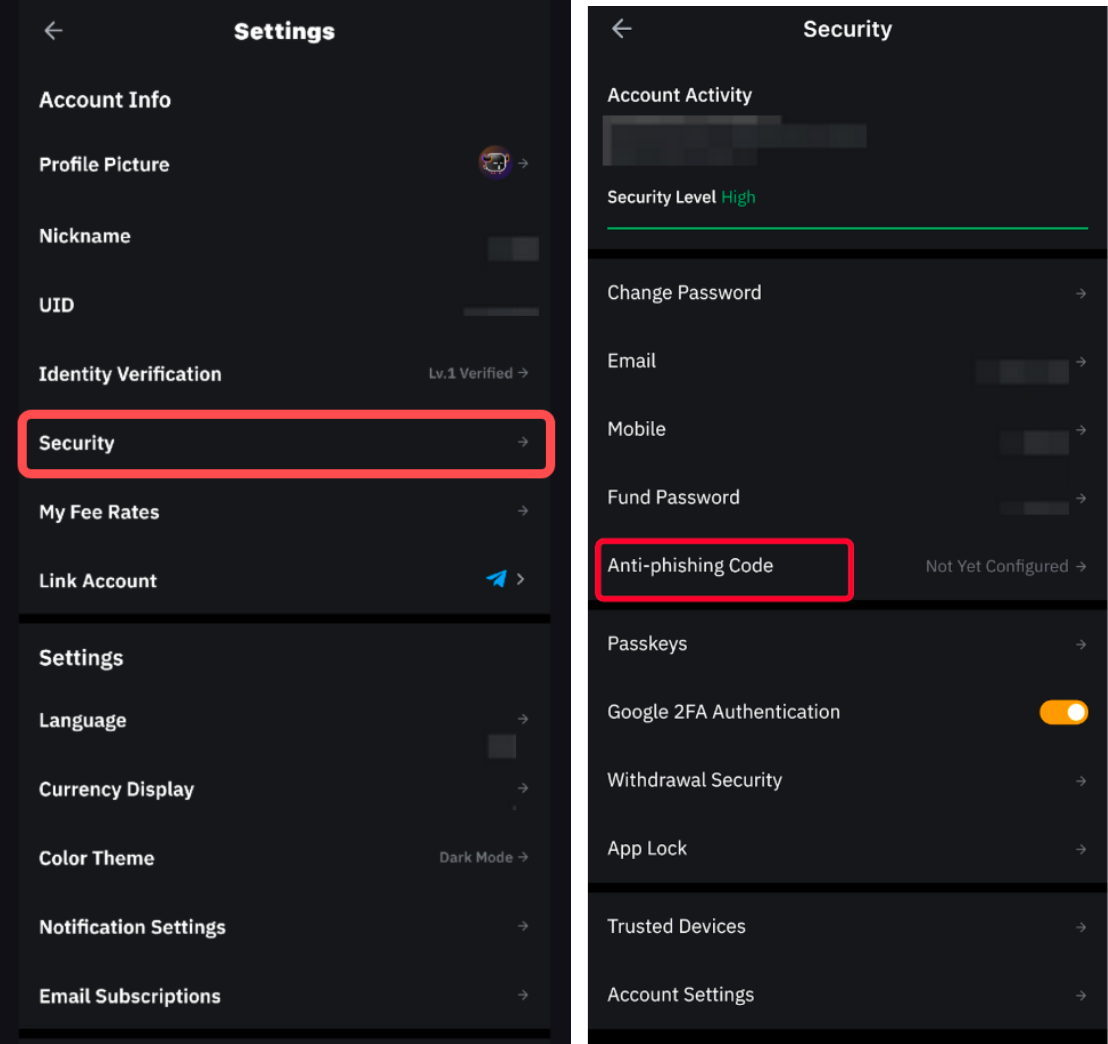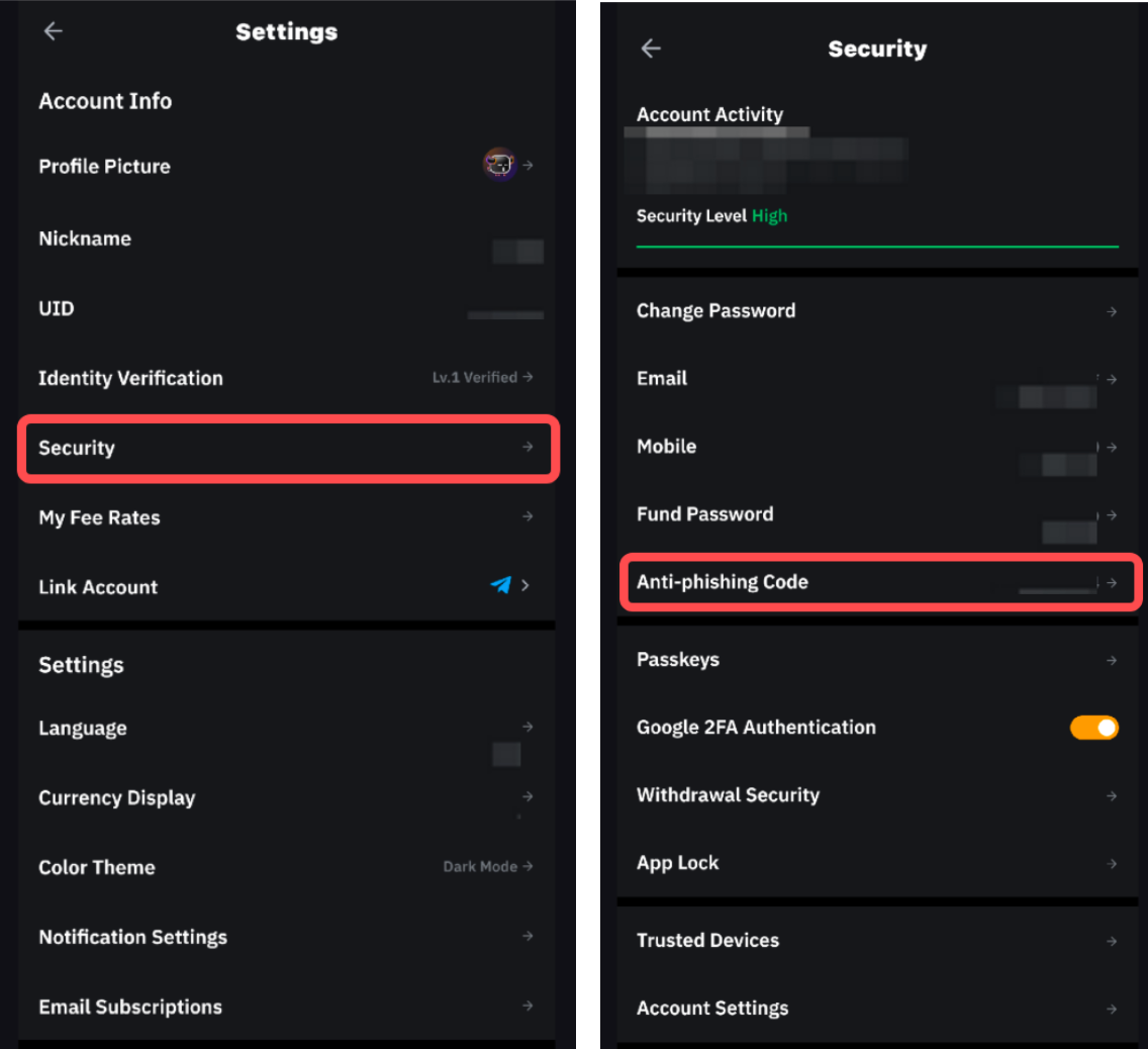 Bybitで現在のアンチフィッシングコードを変更するには、セキュリティをタップして、アンチフィッシングコードを選択します