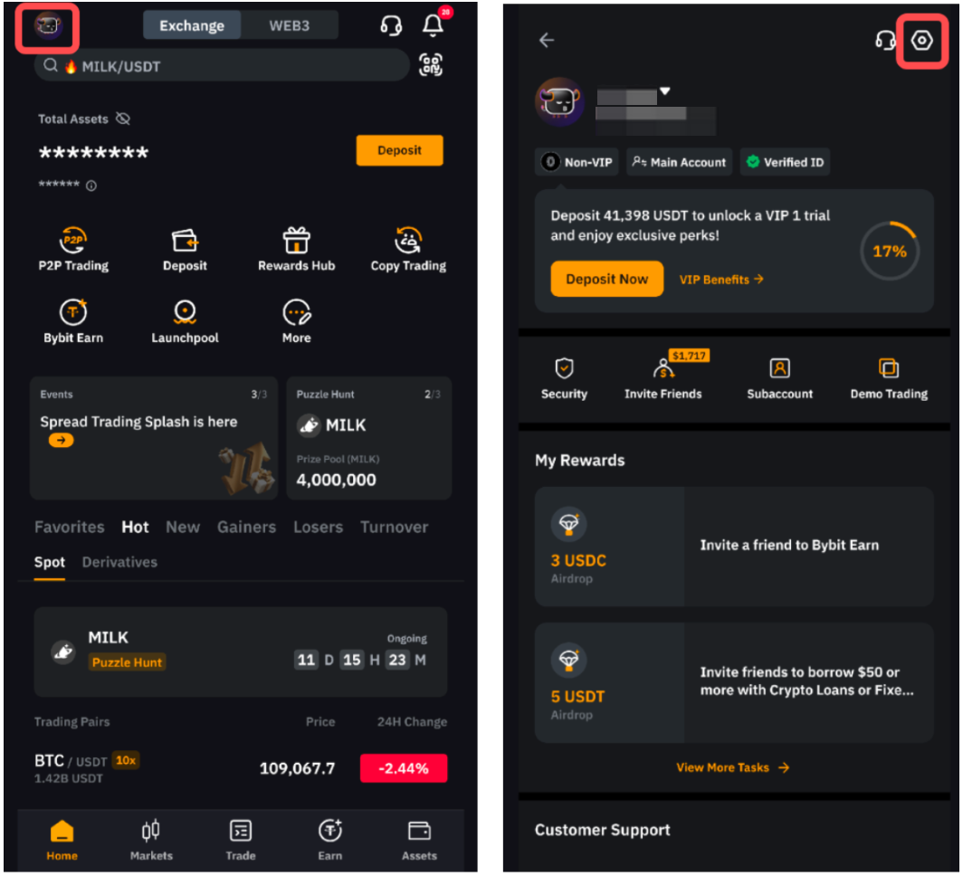 ステップ1: Bybitアプリにログインし、左上隅のプロフィールアイコンをタップして、右上隅の設定アイコンにアクセスします。